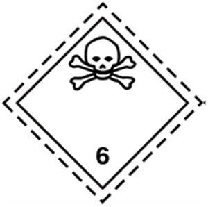 415. The hazard label with a circle overlapped by 3 crescents and the small number 6 in the lower corner refers to the class: Nhãn nguy hiểm có hình tròn chồng lên 3 lưỡi liềm và số 6 nhỏ ở góc dưới đề cập đến phân loại: