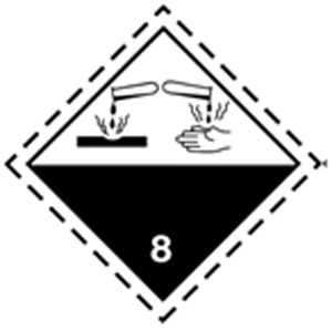 419. Danger label with droplets dripping from two test tubes on one hand and on a plate on a white background in the upper half, and the black lower half refers to the class: Nhãn nguy hiểm với các giọt nước chảy từ hai ống nghiệm trên một tay và trên một đĩa trên nền trắng ở nửa trên và màu đen ở nửa dưới đề cập đến phân loại: